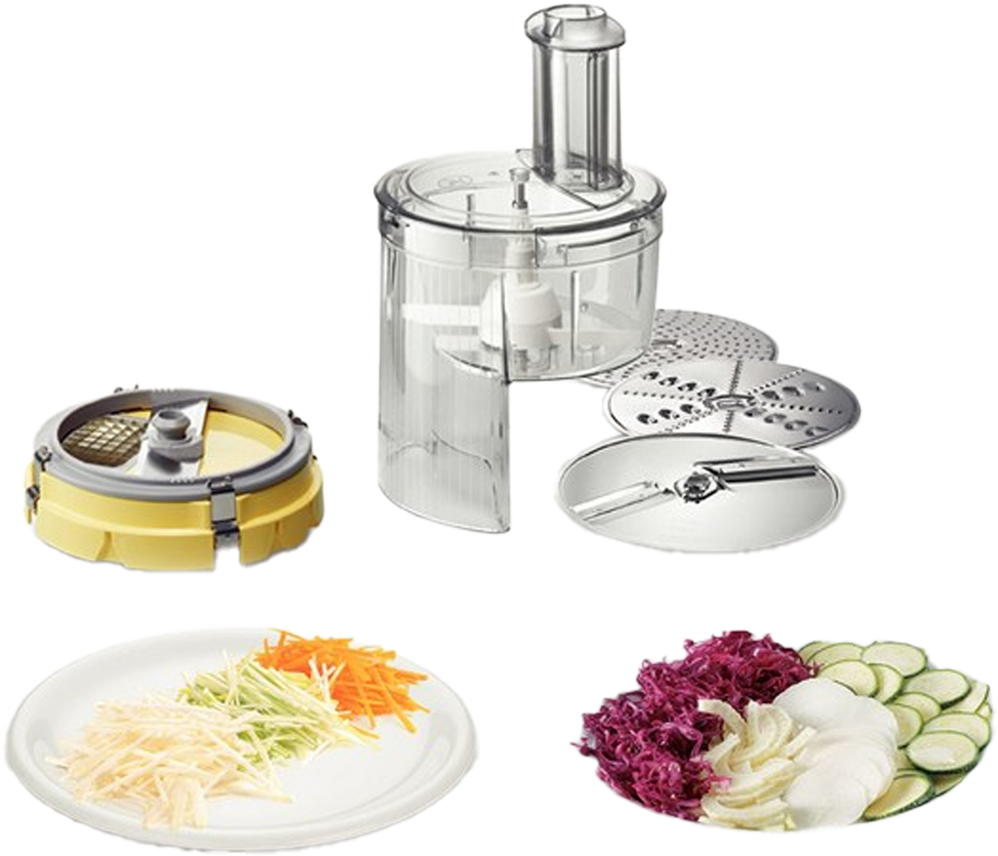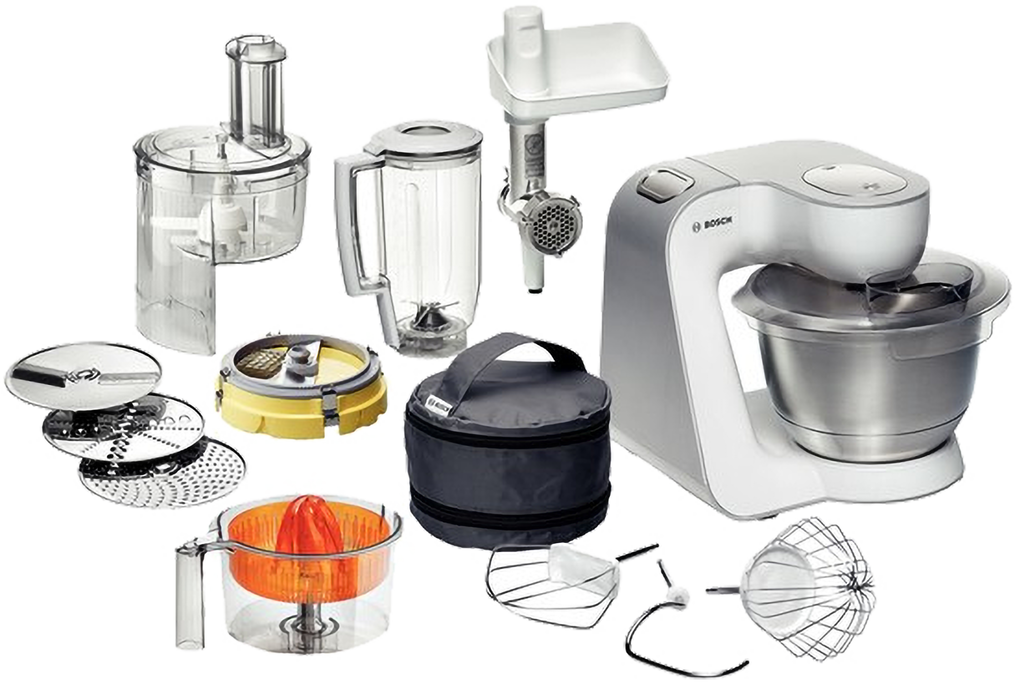 Lieferumfang: Schneebesen, Knethaken, Mixeraufsatz, Spritzschutz, Rührschüssel, Fleischwolf, Zitruspresse, Würfelschneider, Schnitzelwerk, Rezept-DVD, Tasche, Scheibenträger